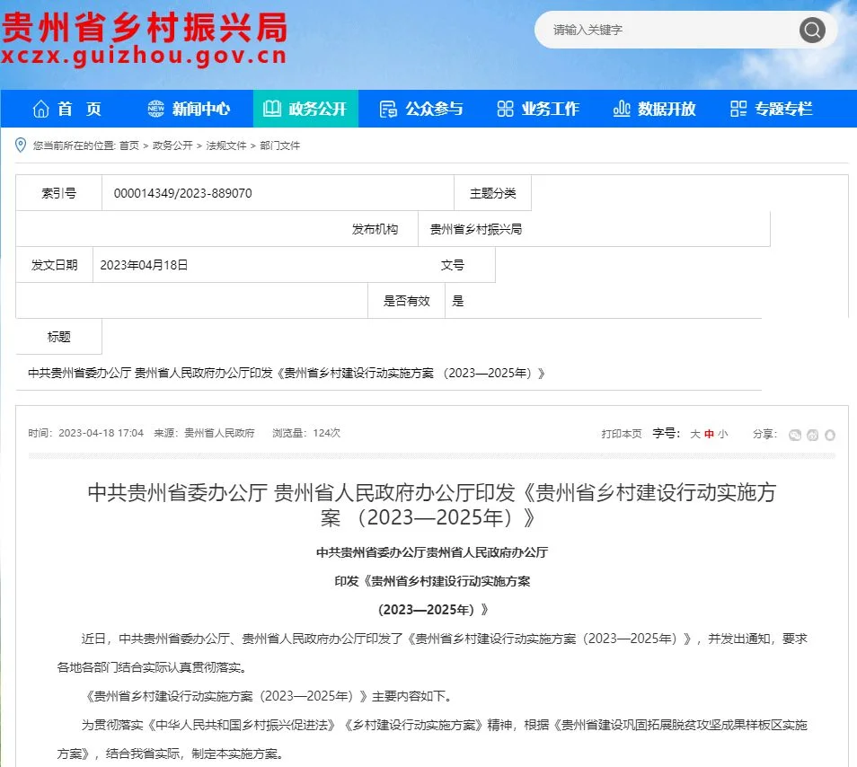 2023年4月,中共贵州省委办公厅、贵州省人民政府办公厅印发《贵州省乡村建设行动实施方案(2023-2025年)》。