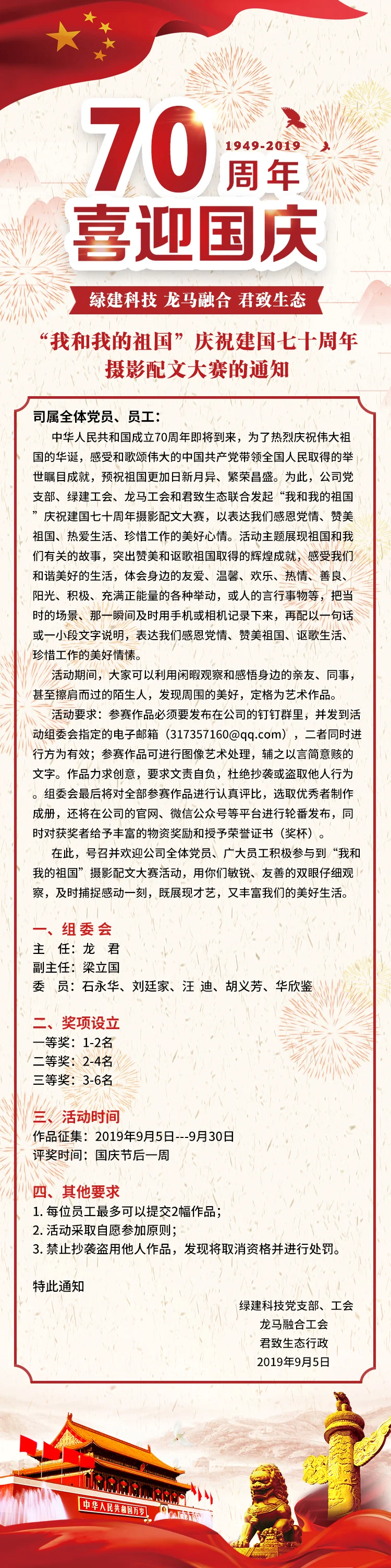 9月2日,为热烈庆祝伟大祖国的70华诞,感受和歌颂伟大的中国共产党带领全国人民取得的举世瞩目成就,预祝祖国更加日新月异、繁荣昌盛。绿建科技决定由公司党支部、工会、行政联合发起“我和我的祖国”庆祝建国七十周年摄影配文大赛,以表达广大员工感恩党情、赞美祖国、热爱生活、珍惜工作的美好心情。