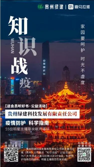 2020年2月18日,贵州绿建科技发展有限责任公司联合国内知名的有声总用户规模突破6亿的音频分享平台——喜马拉雅(贵阳)公司,利用在线移动音频分享平台进行科学防控战疫情宣传活动。活动中让广大员工和家人在“喜马拉雅”平台上收听各种科学防控新冠肺炎疫情知识,还可成为会员收听平台里丰富的其他音乐、文艺等正能量的海量内容。