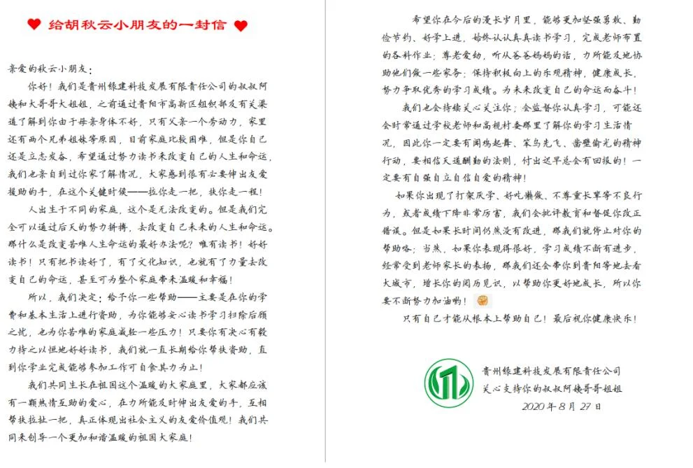 在新落成的高枧村村委会办公楼会议室,梁立国副总经理将一封热情洋溢的信交到两个孩子手上。并代表公司对两个孩子进行鼓励和承诺,只要他们刻苦努力,积极进取,绿建科技公司将长期进行资助,直到孩子们学业结束能自食其力。但资助资金将根据实际情况,每个季度给付一次,以避免大手大脚乱花费。同时,只要孩子们勤学上进、成绩优秀、孝顺长辈,今后还将择机带他们到外面的大城市开眼界、长见识。