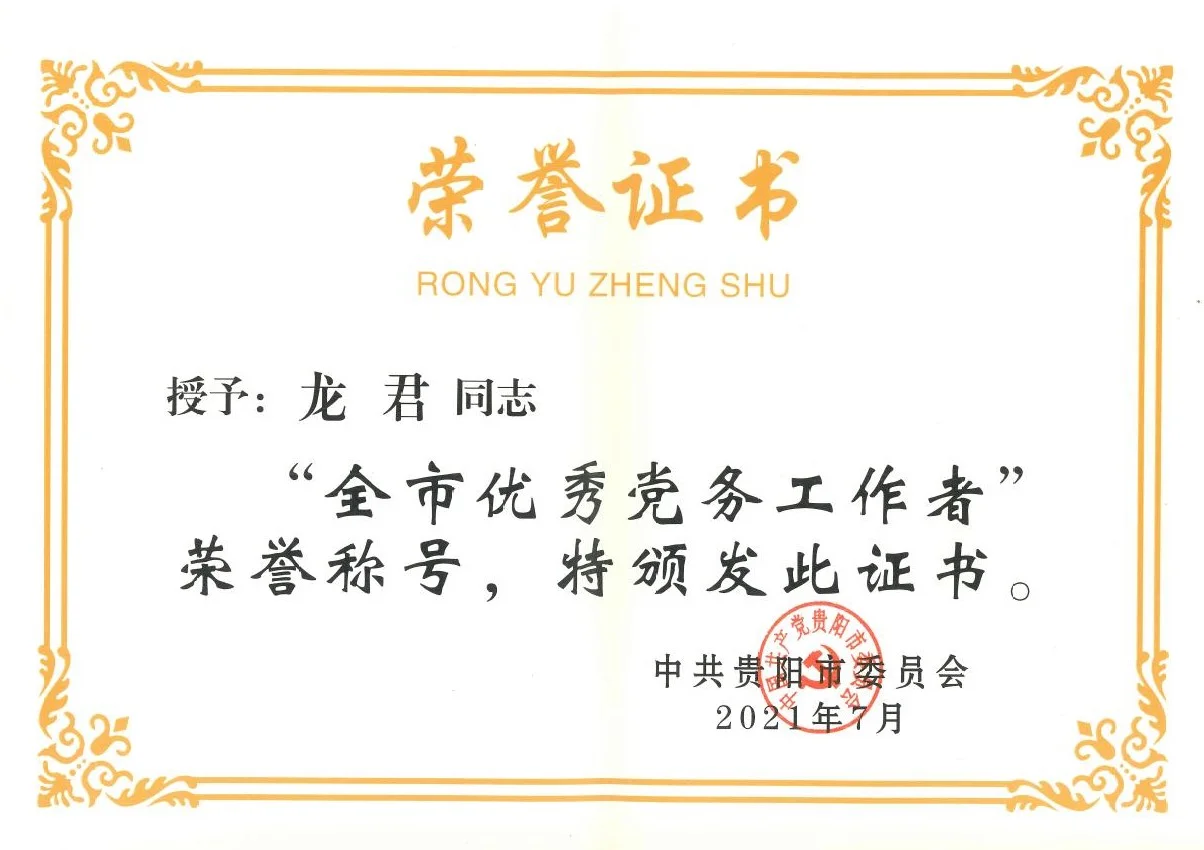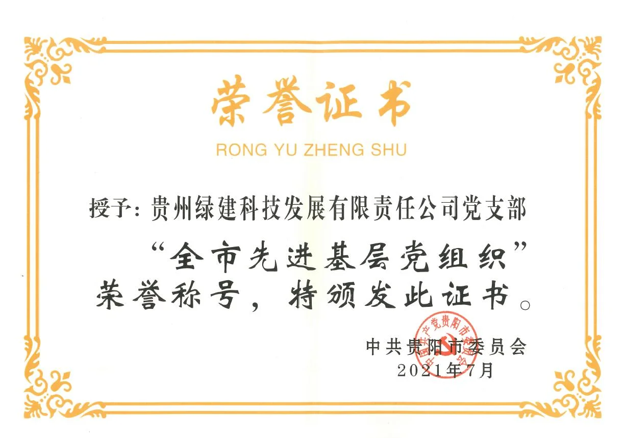 2021年7月3日,正值建党百年华诞之际,中共贵阳市委员会授予贵州绿建科技发展有限责任公司党支部“全市先进基层党组织”荣誉称号,授予龙君同志“全市优秀党务工作者”荣誉称号。
