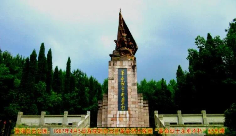 白云区革命烈士陵园主体由纪念碑、墓台、纪念台组成。纪念碑高 11.3 米,碑身用黑色大理石饰面,正面镌“革命烈士永垂不朽”八个大字,背镌碑铭。碑顶为人民子弟兵群像雕塑。
