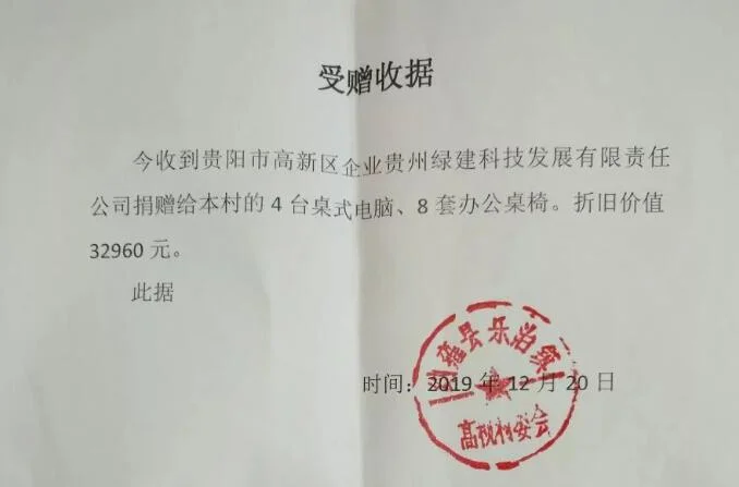 为进一步贯彻落实好党的十九届四中全会精神,积极践行企业的社会责任,努力推动脱贫攻坚战役,更好的帮助困难群众解决实际问题。贵州绿建科技发展有限责任公司在总经理龙君同志的亲自安排下,向贵州毕节纳雍县贫困地区捐赠了一批办公电脑设备和桌椅家具。 2019年12月20日,贵州绿建科技发展有限责任公司(以下简称:绿建科技)在其总部完成了对纳雍县乐治镇高视社区办公设备的捐赠活动。乐治镇副镇长陈震和高枧村支部书记宋志林,以及绿建科技公司的党支部副书记等相关同志进行了交接,并将电脑、办公桌椅等设备搬运完毕。 捐赠设备包括4套台式品牌电脑,8张品牌办公桌,24张滑轮办公椅,总价值约三万二千余元。 作为一家具有高度社会责任感的民营企业,绿建科技在不断发展壮大的过程中,一直关注国家精准扶贫政策并积极参与其中,通过本次爱心捐赠,进一步强化了公司的社会责任感,弘扬了社会正能量,以实际行动诠释了中华民族“扶贫济困、乐善好施”的美德,营造了奉献爱心、回报社会的浓厚氛围。 在决战脱贫攻坚的紧要关头,绿建科技公司秉承“不忘初心,牢记使命”的教诲;下一步,公司全体党员还将自发以个人名誉参与扶贫济困活动。在公司党支部、总经理龙君同志的带领下,绿建科技将竭尽全力,为实现习近平总书记的伟大号召,在2020年全面完成脱贫攻坚战,使全国人民共同迈入全面建成小康社会贡献自己的力量。