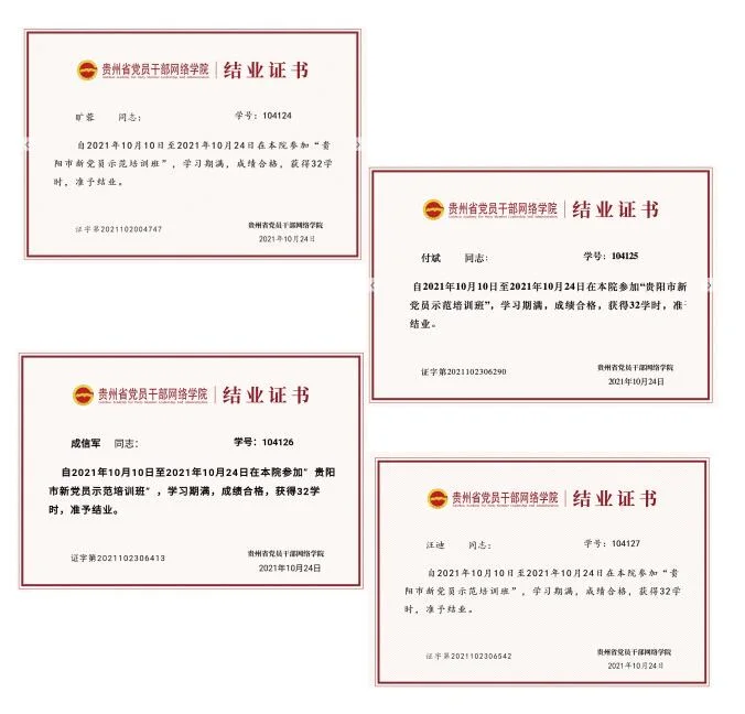 根据贵阳市委组织部的安排,2021年度以来新如党的党员同志于10月10日至10月24日参加贵阳市新党员示范培训班学习,绿建科技党支部参与学习人员有旷蓉、付斌、汪迪、成信军四名同志。