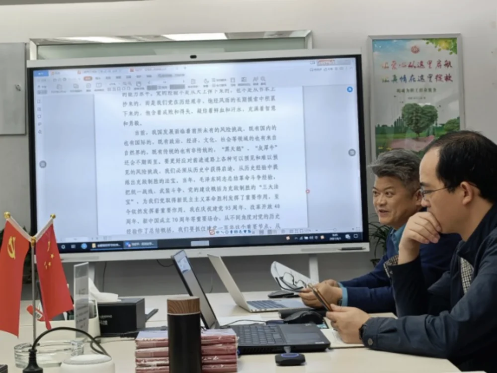 2021年6月1日清晨,贵州绿建科技党支部全体党员、预备党员、积极分子、入党申请人等齐聚一堂,开展本期的主体党日活动会。活动会一开始,石书记汇报近期支部党建暨队伍发展情况,以及党史学习教育活动计划与责任分解。紧接着延续上一次活动会的“一把手”领学的学习任务,龙书记带领支部全体成员第二次专题学习习近平总书记《在党史学习教育动员大会上的讲话》,深入学习习总书记的金句,进一步感悟其新思想的伟大魄力。